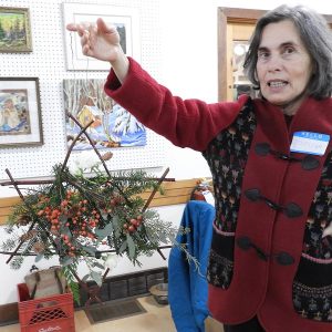 Wreath made of grapevine features winterberries and milkweed; Maryjka Mychajlowycz displays a dogwood twig star.