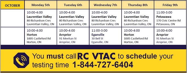 Renfrew County Paramedics are holding COVID-19 testing this week at the locations listed below. Please note that when you call for an appointment, you will be screened pursuant to Ontario’s latest regulations about testing.