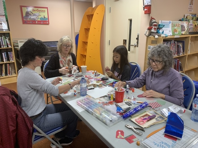 On Saturday, Oct.18th, MVPL held an Open House for the community to learn about library services. At top from left: Dorinda and Alphonse Lorbetski, Mary Blank, Jen Mills, Brynley Yantha, and Lynda Lepinskie at the Open House. (Photo submitted) Barrington explained there are information posters up in the Library, and a feedback survey is available for Library patrons all week long. She said, “On Saturday, we offered coffee, tea and baked goods. We provided a scavenger hunt for children, a puzzle for anyone who wished to hang out, a large colouring poster for children, take-home craft kits, and information on becoming a Library Board member. In the afternoon, our Artist of the Month, Nicole Conway, ran a craft workshop, teaching participants to make gift tags with materials from around the house.”
