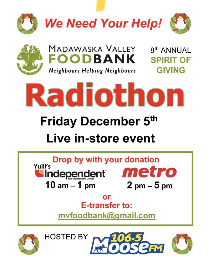 If you’re concerned about the high cost of groceries, spare a thought for the Madawaska Valley Food Bank as they prepare for the annual Radiothon on December 5 in Barry’s Bay. It’s their major end-of-year fundraising event with a goal of $20,000 that day – a sum that will bring them much closer to the hoped-for total of $45,000 for 2025.