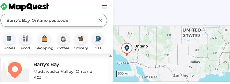 Editor’s Note: When this letter arrived, we tried to find the correct Barry’s Bay postal code via google maps. See photo above for the result – not the same outcome (Whitney postal code) that the writer received, but still an incorrect code. We hear you, Rory. For years we have struggled with online orders, financial institutions, and more who will not believe that our civic address exists – even when we manually input all details including the correct postal code. Yet Matcheski Road has been so named for 30-plus years.