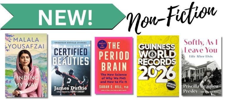 New Non-Fiction titles: Finding My Way by Malala Yousafzai, Certified Beauties by James Duthie, The Period Brain by Sarah E Hill, Guinness World Records 2026 (Canadian Ed), Softly, As I Leave You by Priscilla Beaulieu Presley (Above)