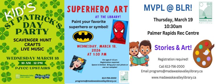 How will Valley parents keep the kids busy and out of trouble this March Break? The clever ones take advantage of quality children’s programming available from Madawaska Valley Public Library. Here’s a rundown of some activities and events planned for kids next week. Please be sure to register as early as possible for these in order to avoid disappointment. Email the Library at programs@madawaskavalleylibrary.ca or call the Library during regular hours at (613) 756-2000.