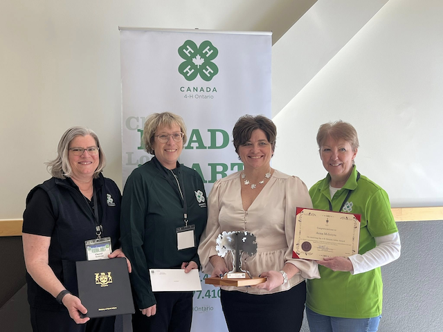 Anna McIntyre of Renfrew 4H Association was one of three volunteers honoured on March 21st by Ontario 4-H for exemplary volunteer service. Anna is shown below alongside Cheryl Sullivan, 4-H Ontario staff, and Jennifer Waldroff and Sharon Halpenny, Ontario 4-H Council Board Directors. (Photo submitted).